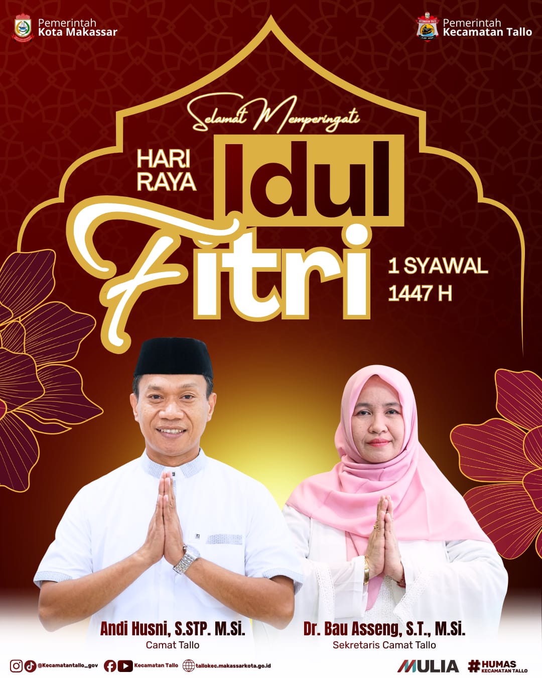 BN Online, Makassar–Nuansa penuh kebersamaan dan saling memaafkan menyelimuti suasana Idul Fitri 1 Syawal 1447 Hijriah di Kecamatan Tallo. Camat Tallo, Andi Husni, S.STP., M.Si., bersama Ketua TP PKK Kecamatan Tallo, Dian Friani Husni, mengucapkan selamat Hari Raya Idul Fitri kepada seluruh masyarakat, Jumat (20/3/2026).